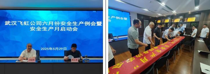 5月29日,飞虹公司在新阳大厦14F会议室召开六月份安全生产例会暨“安全生产月”启动会,公司党委书记、董事长朱立余,党委委员、副总经理汤进希及各部门、所属单位、项目部负责人共44人参加会议。会议组织与会人员深入学习近期重要安全生产会议与文件精神,并集体观看《2025年安全生产月宣传视频》等警示教育片,通过典型案例剖析强化安全责任意识。现场举行的集体安全宣誓及签名仪式成为亮点,全体人员在主题横幅上郑重签名,形成“一级抓一级、层层抓落实”的责任传导机制,为安全生产月活动拉开序幕。